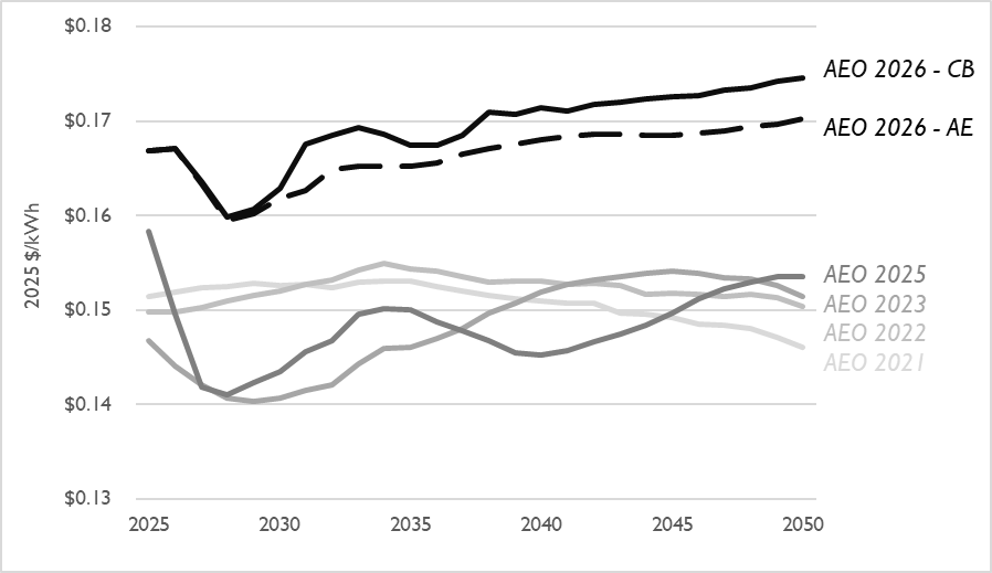 AEO 2026 represents a large jump in projected electricity prices for the residential, commercial, and industrial sectors over prior projections. In the residential sector, the AEO 2026 Counterfactual Baseline projects an average retail electricity price for U.S. residential electricity consumers of $0.17 per kWh in 2026, up from the $0.15 per kWh projection made by AEO 2025, or an increase of 12 percent (see Figure 1). These upward projections reflect the observed real increases in electricity prices across the country. We hypothesize that this jump in projected electricity prices in AEO 2026 is driven by factors such as electricity demand growth, new policies in 2025, and upward natural gas price trajectories. In fact, AEO documentation notes that natural gas prices and electricity prices are tightly correlated. AEO 2026 has a higher natural gas price trajectory for residential consumers relative to AEO 2025, indicating overall increases in energy prices for residential consumers. Across sectors, the jump in projected electricity prices from AEO 2025 to AEO 2026 was steepest for the residential sector, though also present for the commercial and industrial sectors.