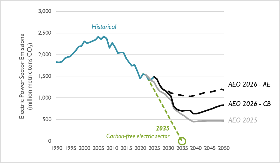 Current policies will not achieve a carbon-free electric sector, and AEO 2026 even projects an uptick in electric sector CO2 emissions after 2040
