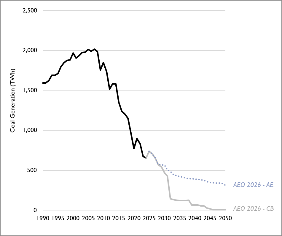 Figure 4. Comparison of coal generation under the AEO 2026 Counterfactual Baseline case (with 111 rule) and the Alternative Electricity case (no 111 rule)