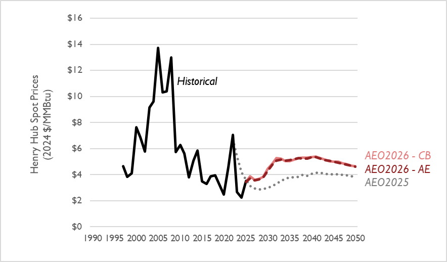 Projected Henry Hub prices are very similar across the Counterfactual Baseline and Alternative Electricity cases in AEO 2026 (see Figure 5). In fact, Henry Hub price trajectories are very similar across all AEO 2026 cases, except for the High Oil and Gas Supply and Low Oil and Gas Supply cases (not pictured), which set much lower and higher bounds on Henry Hub prices, respectively.