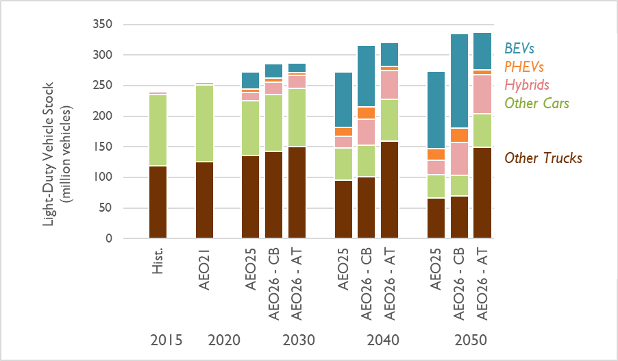 The AEO 2026 Counterfactual Baseline case projects higher growth across vehicle categories, especially hybrid vehicles, compared to AEO 2025’s reference case. The Counterfactual Baseline includes EPA’s vehicle tailpipe emission standards for model years after 2027. However, to understand the potential impact of removing these standards, EIA also modeled an Alternative Transportation case without these standards and with subsequent adjustments to vehicle manufacturing growth and charging infrastructure buildout. Under the Alternative Transportation case, battery electric vehicles (BEVs) make up a much smaller share of light-duty vehicle stock by 2050 compared to the Counterfactual Baseline that has standards in place, demonstrating the important role of regulation in driving electric vehicle adoption and manufacturing decisions.