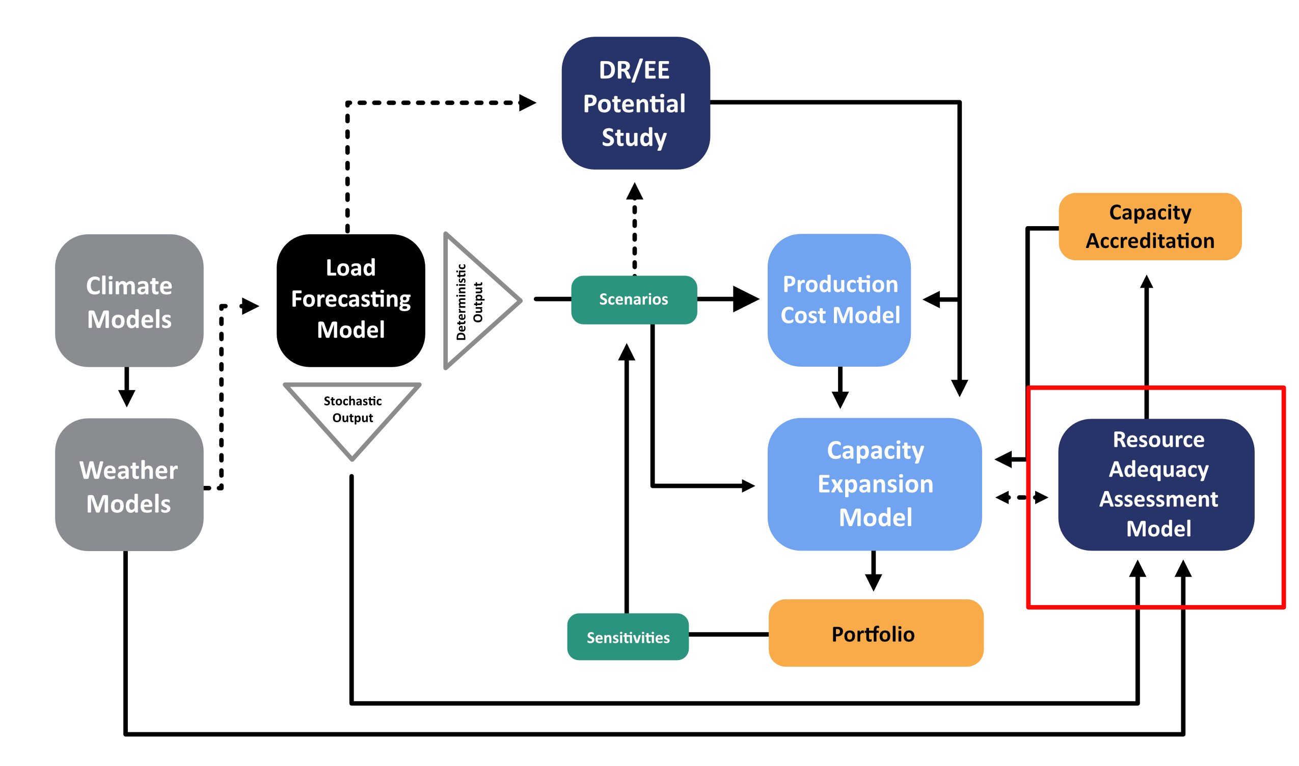 The figure below illustrates how resource adequacy models interact with other electric sector planning models in a utility resource planning process.